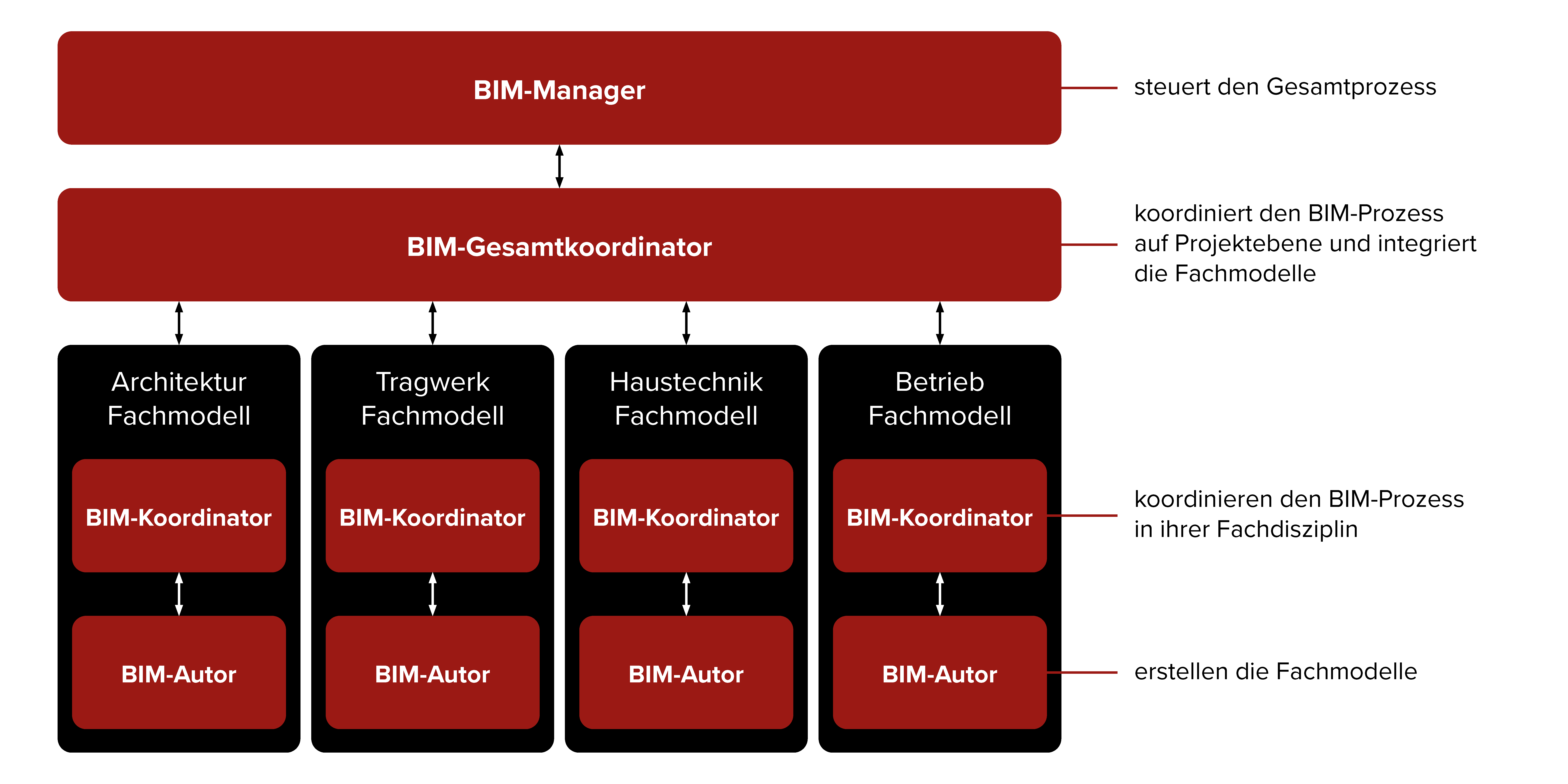 Der BIM-Gesamtkoordinator ist das Bindeglied zwischen dem BIM-Manager (strategisch) und den BIM-Koordinatoren sowie BIM-Autoren/Fachmodellierern (operativ). Er kümmert sich um die fachspezifische Modellkoordination innerhalb eines BIM-Projekts und ist der Hauptansprechpartner für die digitale Planung gegenüber dem Projektmanagement/BIM-Management.